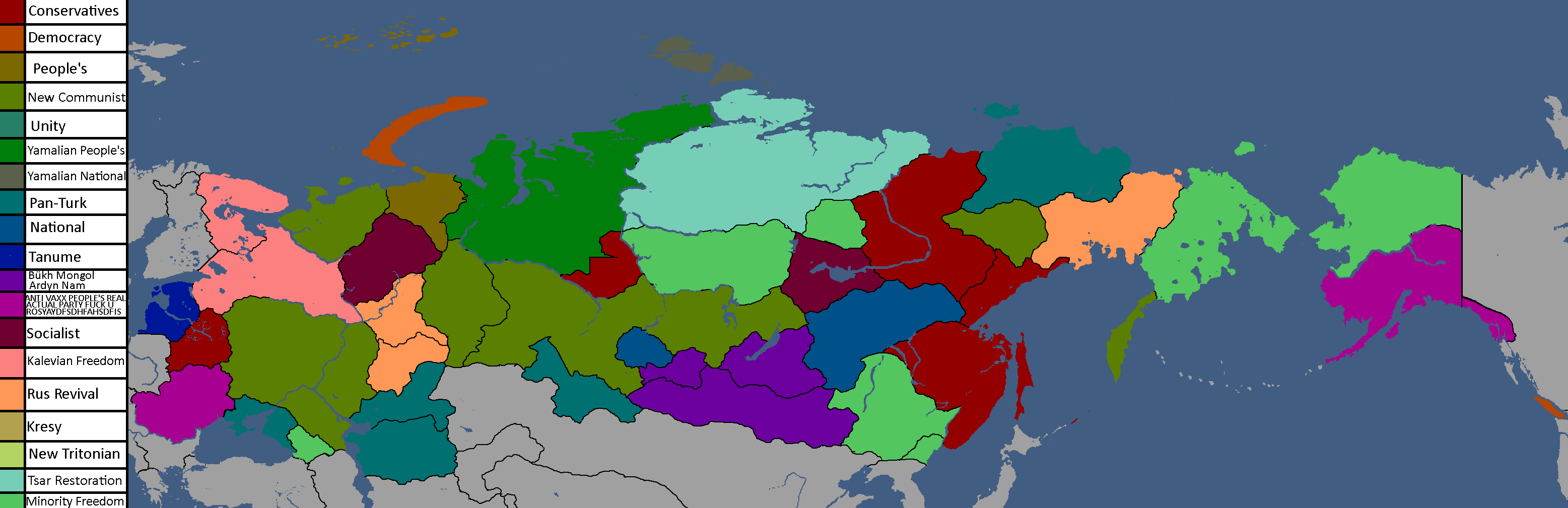 After a year of existing, Rossiya held its first elections contested between the generally right-leaning 'All-Rossiyan Congress', the generally left-leaning 'New Communist Party Government', and the generally separatist 'Coalition of Independent Peoples', with each of these coalitions being composed of numerous local parties. While the individual party which gained the most votes was the Minority Freedom Party, due to votes being transferred onto second-favourite candidates the New Communist Party managed to win (Despite only having 30% of the vote) and form a minority government.