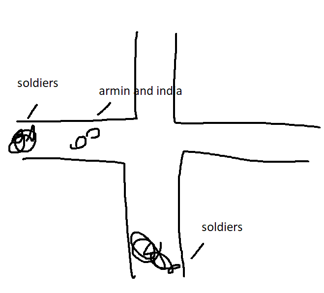 Armin and India start to head out of the airport. And just as they are about to go outside, a soldier stops them.