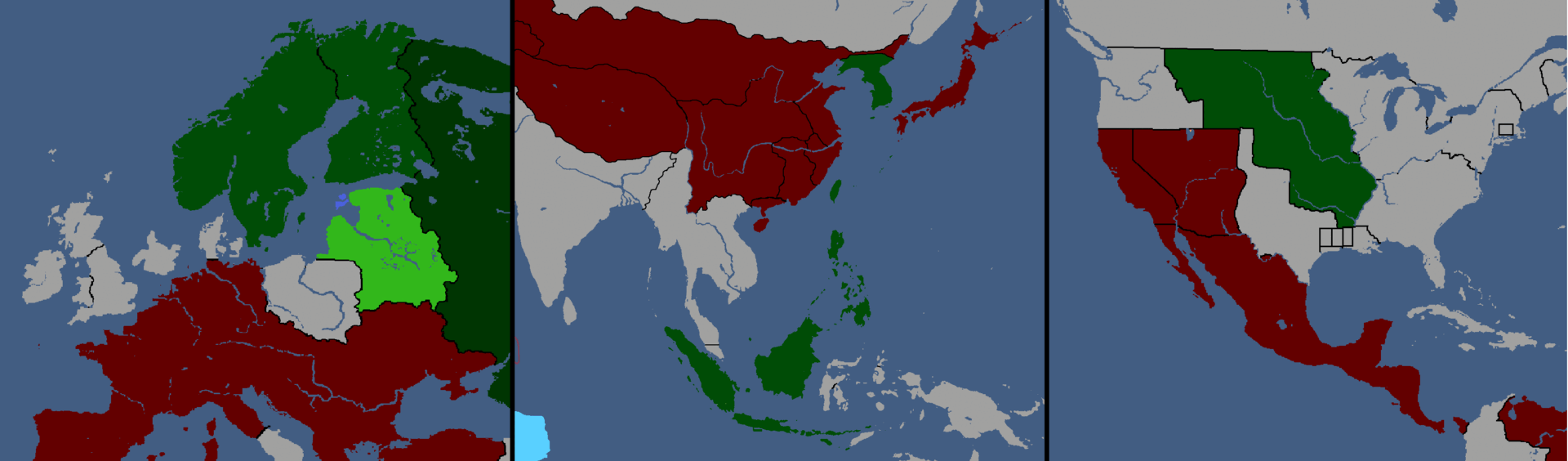 Sizzle finally decided to enact the Tiujuana Pact, organizing Sipedro and Yetia to each attack a New World Order member under the pre tense of them being a traitor. Sizzle decided to go after Minguo and Poavak, Sipedro went after Lakotah, and Yetia went after Svealand, Kalevala, and Tanume, accusing all of them of providing info to the Free Coalition. All of the 3 Tiujuana Pact members rushed across their enemies' borders, prompting Minguo to invade Sizzlean Yakamoto in order to set up base in a more defensible position as its mainland had fallen and Sizzle was focused on invading Poavak. Yetia managed to break through its enemies' defences while Lakotah's struggles convinced the SSY to join the war out of opportunism. Soon all of the 'dissident states' were defeated and brought under Tiujuana Pact control apart from Minguo in Yakamoto, whose navy was strong enough to keep Sizzle at bay. All the states Yetia invaded were simply turned into puppets while retaining their governments, Sizzle annexed Minguo's mainland, Minguese Taiwan, and the Philippines while setting up a puppet in Poavak, and Lakotah was partitioned along the Missouri River with the SSY annexing the east and the west becoming a Sipedroan puppet.