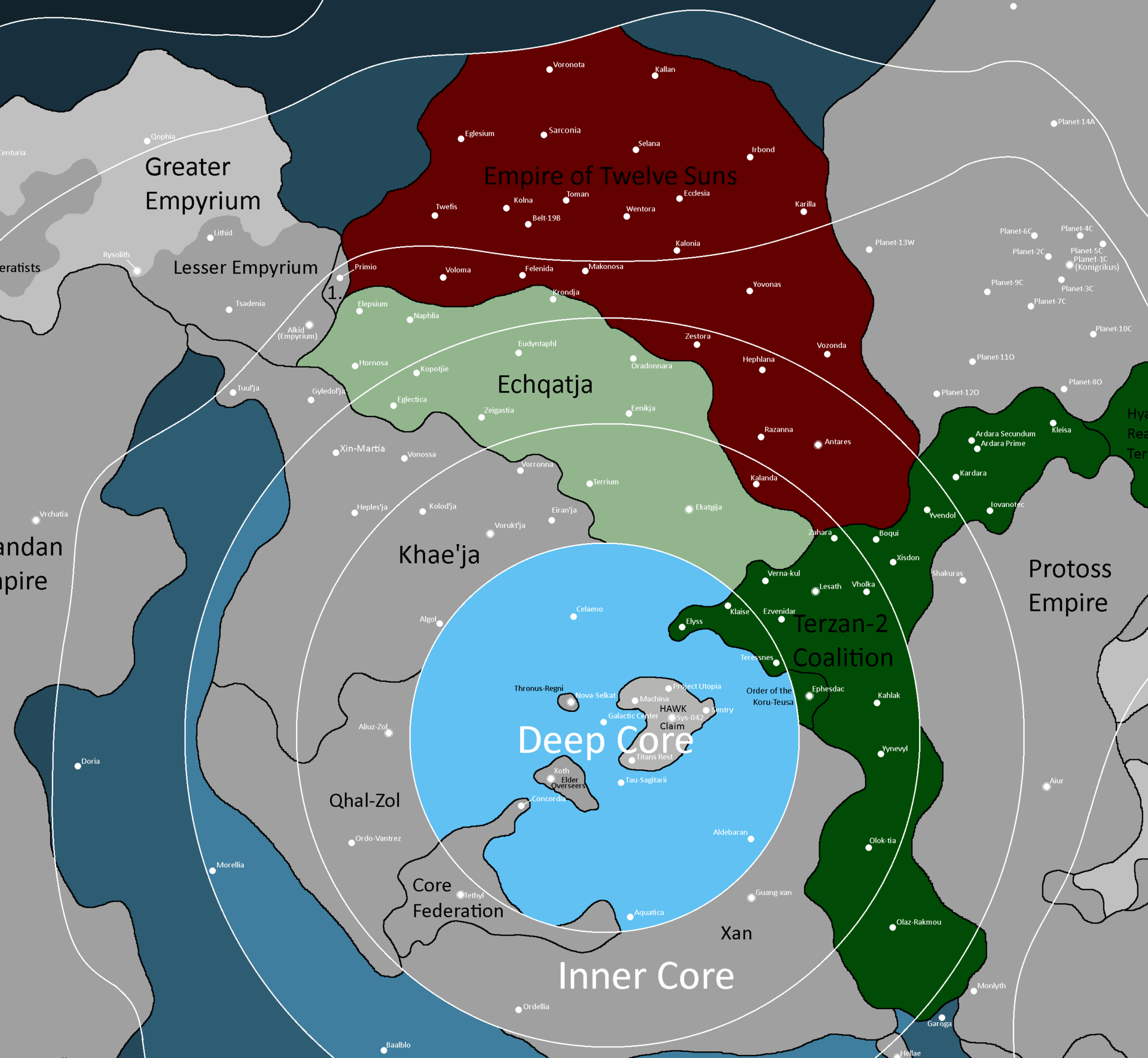 In the west, Twelve-Suns forces managed to occupy the Echqatjan capital of Ekatgija, launching a genocidal massacre which dealt significant casualties to the civilian population, prompting Echqatja's allies of Khae'ja, Qhal-Zol, Xan, and the Martian Exiled Government on Xin-Martia (and the CSIS for some reason) to declare war on the Empire of the Twelve Suns, while the Protoss launched a devastating orbital bombardment of Antares. Now surrounded by enemies, the Twelve-Suns were quite quicckly forced back by their opponents, with Terria-Nel capturing Kleisa, the Protoss' Tal'Darim Death Fleet pushing back the Twelve Suns, and the Protoss' Golden Armada Fleet capturing Razanna. Having lost Razanna and being pushed back on all fronts, many Twelve-Suns fleets began to surrender, with the whole nation soon surrendering in its entirety, agreeing to a non-aggression pact and minor territorial concessions.