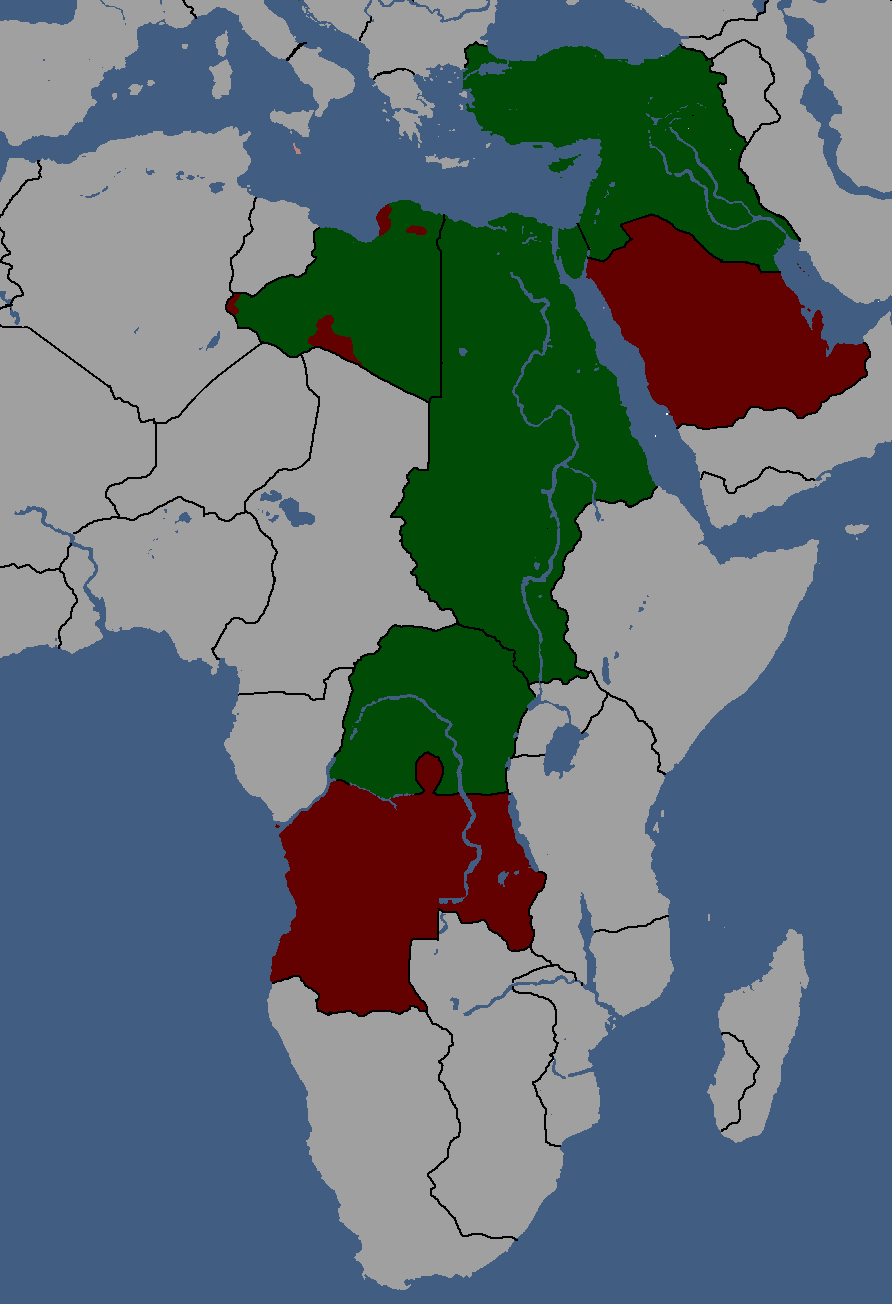 The northeern front began to stall as Khat had pushed quite deep into Jeriya and Sarpistan had fortified its lines, while Hongerswak lost access to its nuclear silos due to the advancing enemy forces. With the HAHATBCAHC losing ground, Yetia intervened in order to occupy Jeriya under the pre tense of protecting its people, promptly landing across the HAHATBCAHC territories on the Mediterranean coast. With Hongerswak continuing to lose, Humambo began to panic as enemy forces began reaching its borders. Hongerswak's president Elena Pianga found herself caught in the city of Nyumba as it was encircled by enemy forces, prompting her to declare Hongerswak's surrender as Zina threatened her death if she didn't, though she was imprisoned regardless. Now alone in the south, Humambo began breaking down as insurrections began to break out in the oppressed fringe regions of the country, leading to it suing for a cease fire. Yetia refused to withdraw its forces from the regions it had occupied due to 'peacekeeping reasons', angering Khat. Zina revealed its true intentions to helping Wanaoishi in a meeting between the two's leaders, demanding that either Wanaoishi join its empire as a puppet or it would restore Hongerswak as something to replace that role, greatly angering Moseka Pianga to the point of trying to attack Zina Echthyt, though they were eventually 'convinced' to back down and agree to become Zina's puppet in return for autonomy and avoiding suffering. Zina promptly forced Wanaoishi to withdraw from the war, leaving the region around the major city of Moja under Humamboan occupation, allowing remnants of the Hongerswakan government to restore order in the city and proclaim Bienheureuse Kasongo as their new dictator due to him being the only elite who had studied political science.