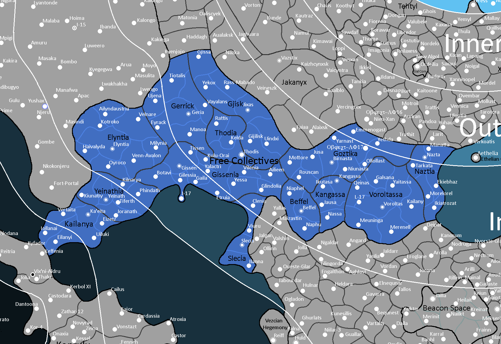 The League of Free Collectives is a confederacy consisting of 13 'spacefaring societies (known as "Collectives") onto themselves which consist of multiple "sectors" that themselves contain countless inhabited Star Systems. Notably, the League's members used to be a part of the Galactic Federation which has allowed them to be surprisingly populous. industrious, and developed when compared to their small size. The League is additionally a member of the Galactic Community.