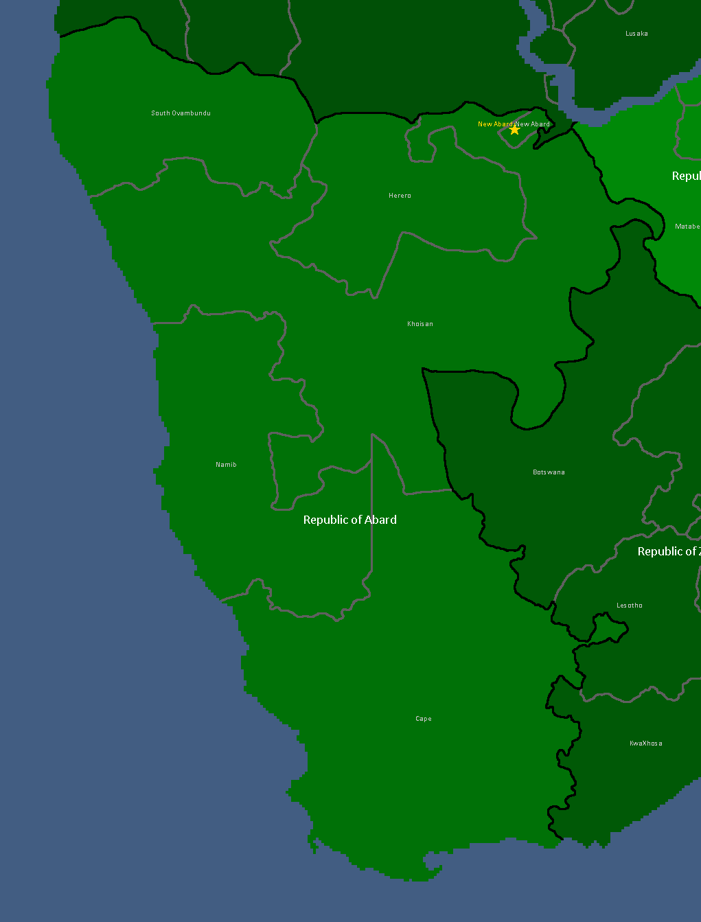 New Abard is the capital and most populous city in the Republic of Abard within the Confederation of Yata located near the Okavango Delta and Zambezi River. The "old town" of the city is built into a series of flat pits roughly 20 meters below sea level, while the rest of the city - including its more modern sections are located in the surrounding savannas. New Abard was constructed after Cape Town was abandoned due to the Plague, serving as a planned Capital to serve as the new centre for Abardean society to work towards revenge against Sizzle whom they blamed for killing the people of Cape Town, seeing them as responsible for the plague. Partially thanks to being founded 'for revenge', New Abard holds a dark legacy of being heavily involved in the practice of Slavery for much of its history until Iain Singleir banned Slavery in Abard. Due to it being quite far inland New Abard exerts little influence in places outside of Abard, with only occasional international conferences being held there.