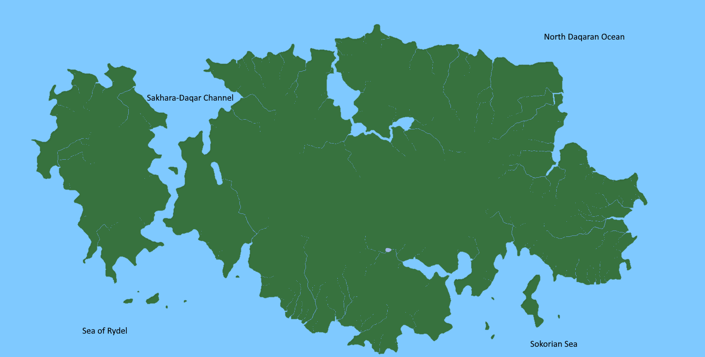 Below this, on the south of Prareus and Southeastern Sokoria is the Sokorian Sea, the smallest of Daqar's oceans. Compared to the planet's other oceans, the Sokorian Sea is much warmer, denser, and saltier - hence why it is categorised seperately.
