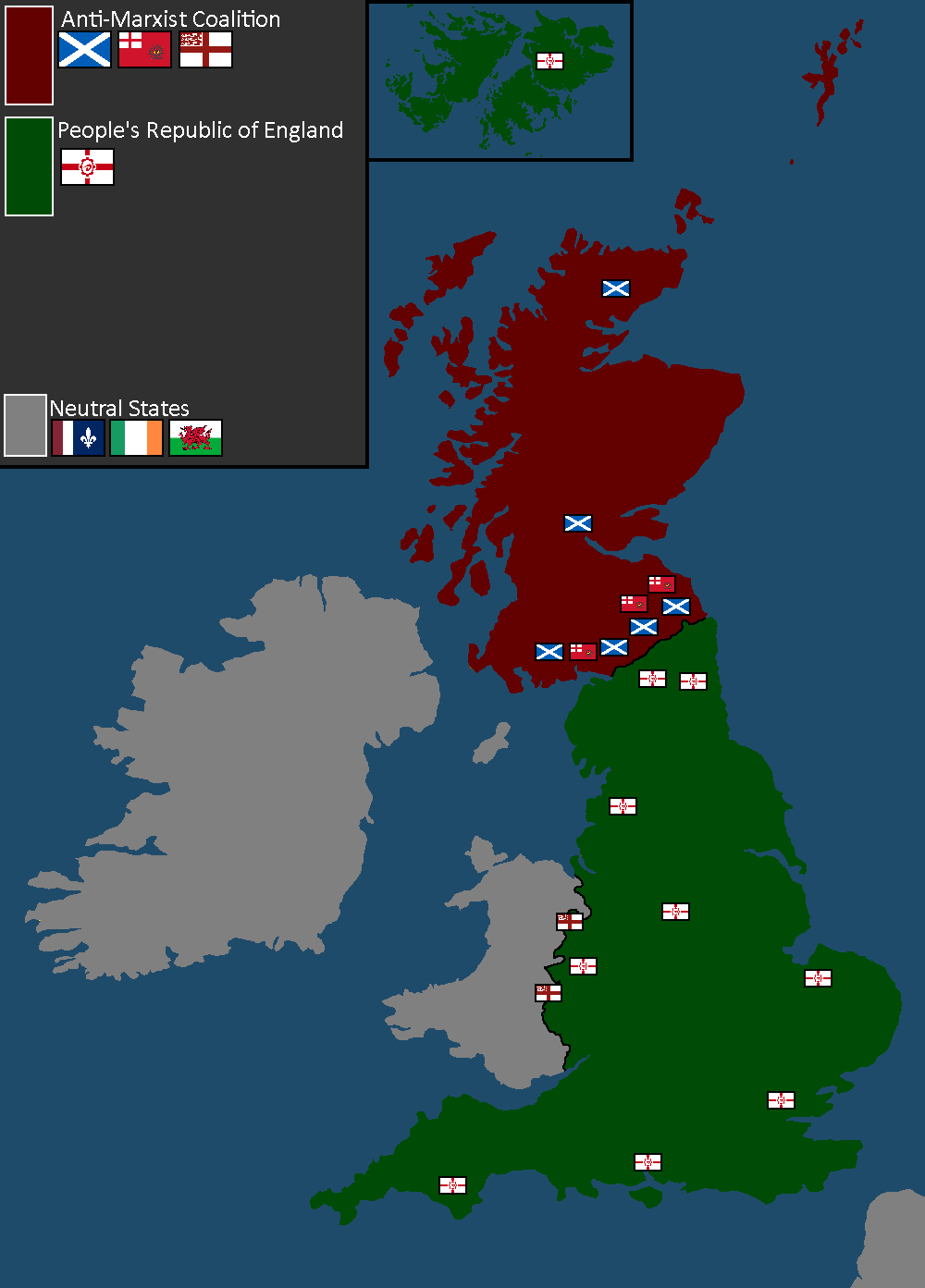 ESP forces in Norfolk were disarmed by the TER as it gradually moved to secure remaining pockets of resistance. Conservative forces launched an offensive into the southwest while TER militias operating in Cornwall and Dorset advanced east, leading to most organized BTNT resistance dispersing as pockets remained in Bristol, the Isle of Wight, and Brighton, though the latter two fell without that much of a fight while the fight for Bristol was a long siege as the BTNT held on for a while until its southern flank collapsed due to defections, leading to the defences in the city slowly crumbling. Seeing no way to actually win the war, the EESP decided that forming an independent northern English state was the only way to maintain socialism in at least some territory, attacking eastward to occupy Yorkshire for their newly proclaimed 'Northumbrian Republic'. Northumbria succeeded in its push to the northsea which allowed it to swing north into Scotland where it captured Edinburgh, forcing Scotland to make peace with Northumbria by recognizing its independence, which the royalists were also pressured to do. This move outraged the TER as its attempts to block the peace were outvoted by the RBE, leading to the English Interim State splitting in two as forces loyal to The English Right overthrew the government and proclaimed the 'National Republic of England', forcing the royalists to flee to the southwest where they proclaimed the 'Kingdom of England', with the two new governments promptly waging war against one another. Once the National Republic managed to crush the Royalist and Cornish insurgencies, it attacked north with relentless force as the peace with Northumbria was voided. Nationalist forces managed to sweep north to Scotland's border and destroy significant numbers of Northumbrian forces in the west, leaving their remaining forces in Yorkshire demoralized and weakened, eventually forcing their remnants to surrender after another nationalist offensive that allowed The English Right to unify England under an authoritarian right-wing regime led by self-proclaimed fascist-populist Raymond Pearce.