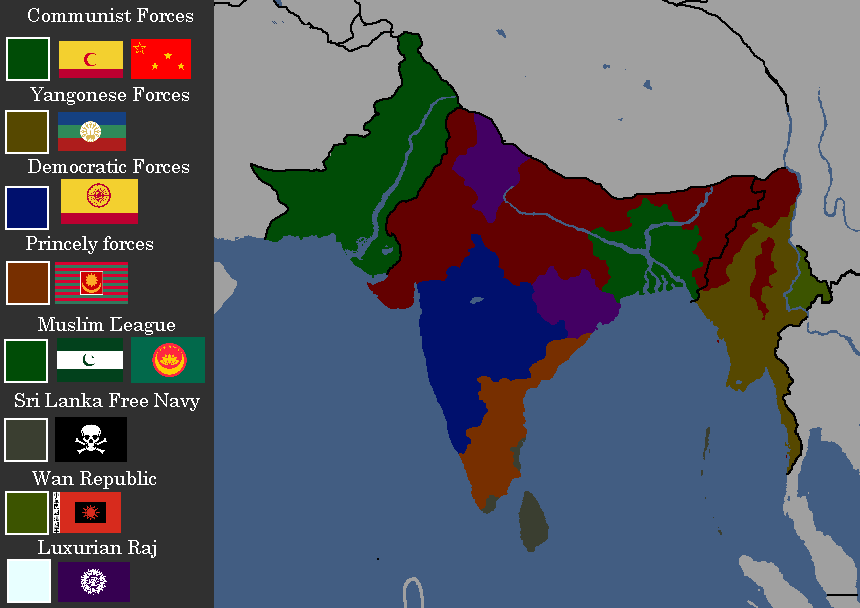 After the events of World War 17, Nilastan was restored as an independent state at last. During its period of being conquered, its western region had broken off as the independent Republic of Synora, which had a revolution to become the Islamic Republic of Synora as to avoid re-integration, leading to conflict breaking out as Nilastan moved to reclaim its territory, though this provoked a massive response in its own country as people didn't want another international war, causing the Islamic Republic of Bengal, Free Republic of Yangoon, Yangoon Military Governorate, Wan Republic, Second Republic of Nilastan, Princely Federation, Sri Lanka Free Navy, and Luxurian Raj to rise up in rebellion. The Nilastani government rather quickly fell apart as it was overwhelmed, allowing the Luxurian Raj to gain the advantage as it captured the capital of Nayasha, soon leading to the People's Republic's collapse as the Luxurians and Pirates formed an uneasy alliance. The rapid expansion of the Luxurian Raj greatly concerned the Anti-Luxuria Coalition especially as their ally of Synora was being threatened after the fall of Pirtil, leading to Yakamoto beginning to support the Islamists. Poavak and Nakmai considered intervention, but they were too damaged by the war to do anything. The situation with the Luxurian Raj became big news in Luxuria proper, pushing many in favour of executing Terry Teur, especially once they managed to claim victory against all other Nilastani factions.
