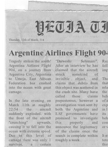 After some time, things began happening again as a large amount of OOG ships exited the facility in Jupiter's atmosphere and two bright flashes were seen in the southern hemisphere of Callisto as a series of unidentified objects were launched, which was detected by a in-construction CSIS space-station outside the killzone tasked with monitoring and intercepting long-range weapons. 2 days after the flashes, a major airplane crash happened over the South Atlantic as Argentine Airlines Flight 904 going from Argentina City, Argentina to Umoja, East African Federation seemingly crumpled in on itself as it collided with a invisible object at 22:54 on the 11th of March according to the sole survivor 'Darweshi Selemani', prompting the Argentine and EAF governments to open a investigation to find debris which could verify this claim. Within a week, the EAF Federal Investigation Department had largely completed its analysis after it recovered 'unusual objects' composed of metals (aluminum alloy and an unknown non-Trigal sturdy material) and electronics that wouldn't be found on a plane and brought them to Maputo for analysis, with the OMM making the connection that the aluminum alloy was also used in OOG satellites. The OMM began its own investigation into the incident by looking into its own surveillance systems (hijacked satellites, radar stations, and hidden drones disguised as ordinary weather equipment) dated at the time of the crash and matching any cloak detections to their registry of such technologies. Eventually the FID managed to get the electronics to an operational enough state to recover some files and photographs;